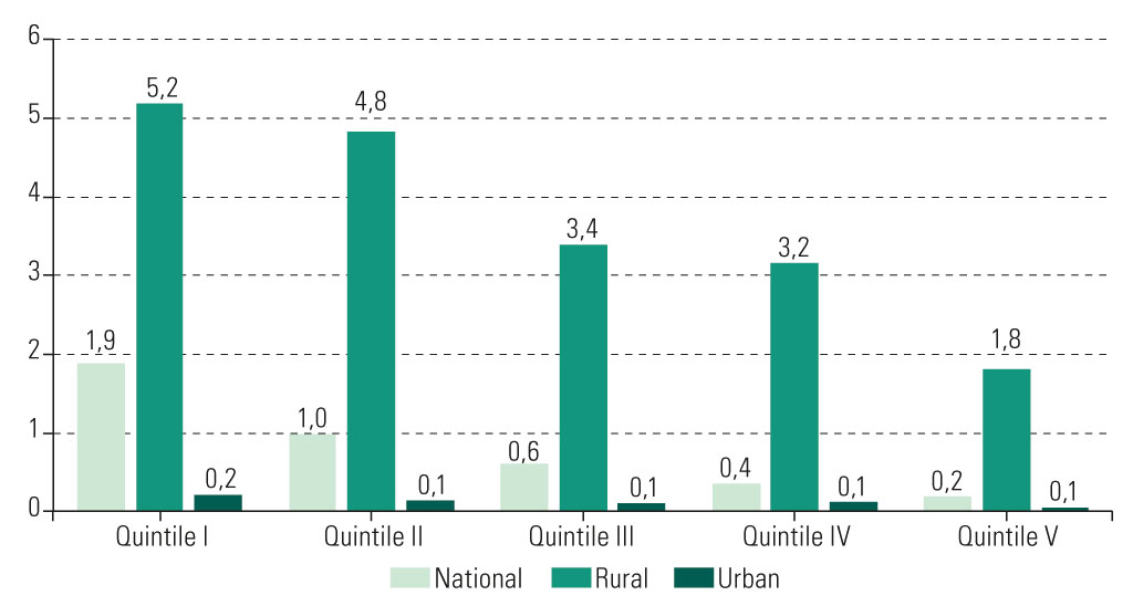 Most of those without access to modern electricity services live in rural and extremely poor areas (quintile I). The population without access to electricity is three times larger than the rural population in the wealthiest quintile and triple that in the poorest quintile (see figure 4).