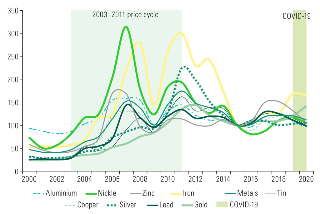 Changes in price indices for metallic minerals and fossil fuels, 2000–2018