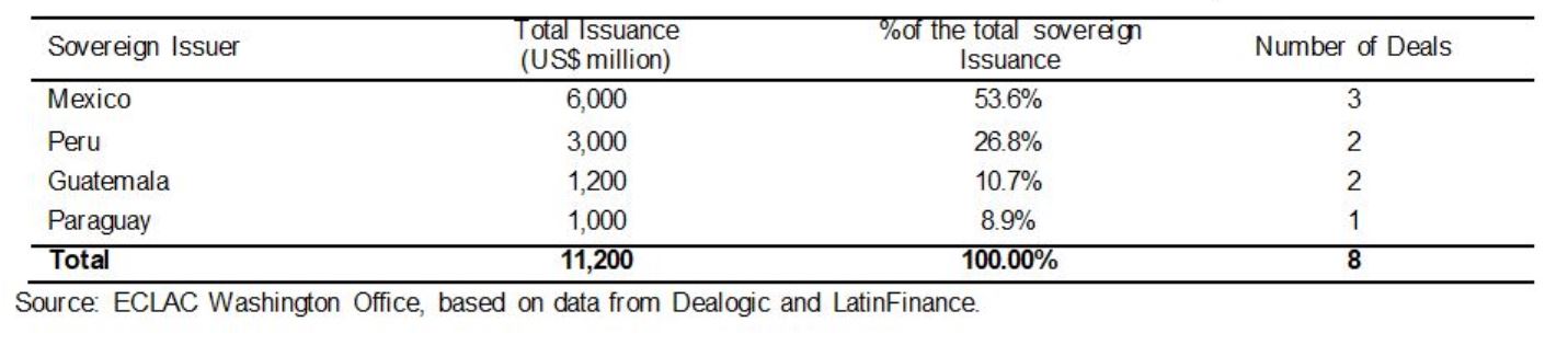 3.- There were five international green bond issuances in the first quarter and a social bond placed by Ecuador. In April, Guatemala issued US$ 500 million in social bonds to finance eligible social investments directly and indirectly related to COVID-19 prevention, containment and mitigation efforts.