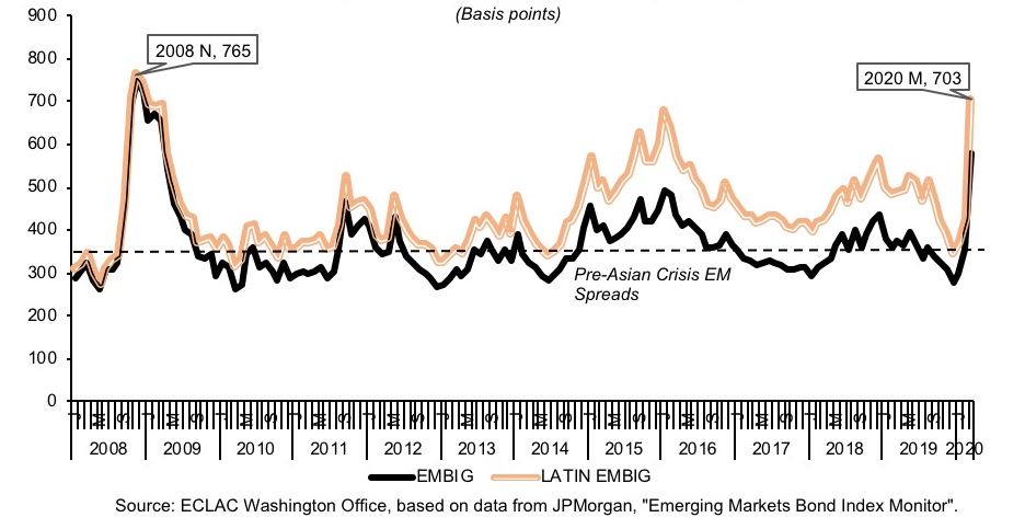 4.- LAC spreads widened 357 basis points in the first quarter as volatility and risk aversion spiked, and were at 703 basis points at the end of March, close to the peak reached in November 2008 during the global financial crisis (765 basis points).