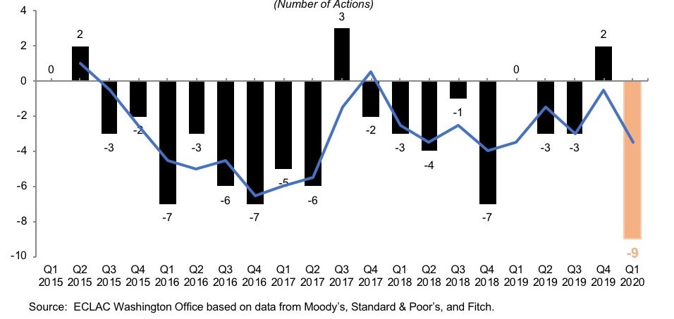 5.- There were nine more negative credit rating actions than positive in the region in the first quarter. In April alone, there were fourteen negative actions, eleven of them downgrades. All of the negative actions in April mentioned the impact of the coronavirus outbreak and of plummeting commodity prices. The commodity-exporters of the region, particularly oil-exporters, were the hardest hit by the downgrades.