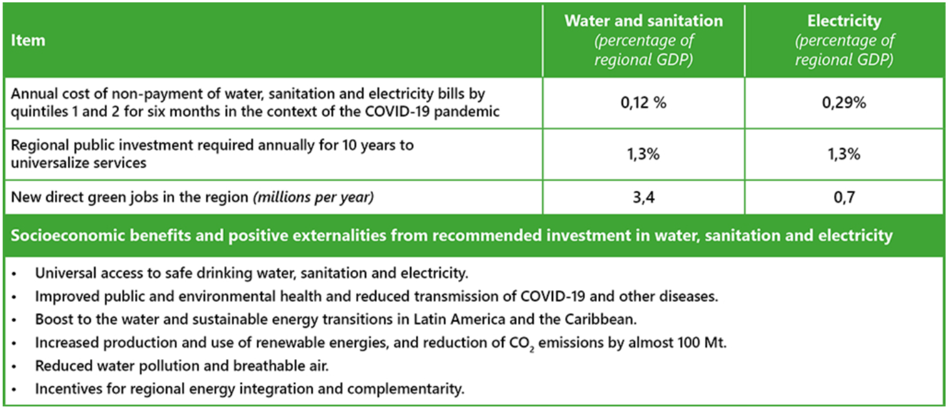 - Reactivation of the regional economy through job creation. 700,000 new jobs in the development of new energy infrastructures, and 3.4 million associated with the drinking water and sanitation sector, per year.