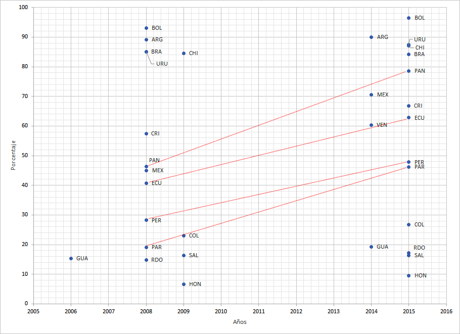 Los mayores incrementos de cobertura se dieron en el Perú (19,6%), el Ecuador (22,1%), México (25,6%), el Paraguay (27,1%) y Panamá (32,2%). Todos esos países se encontraban por debajo del promedio regional en 2008, pero gracias a la implementación de programas de pensiones no contributivas, lograron ampliar la seguridad de ingresos en la vejez (véase el gráfico 1). La situación de otros países como Guatemala, Honduras y la República Dominicana es preocupante, dado que presentaban niveles de cobertura inferiores al 15% al inicio del período en estudio (2008) y en 2015 experimentaron un incremento de menos de 5 puntos porcentuales.