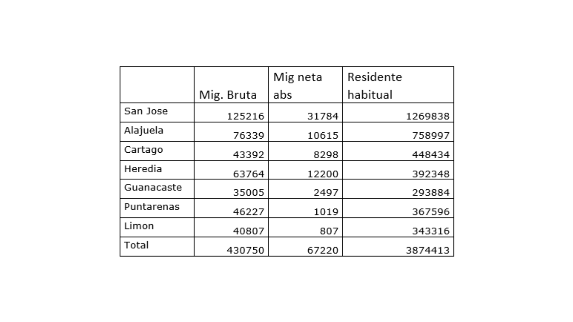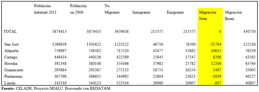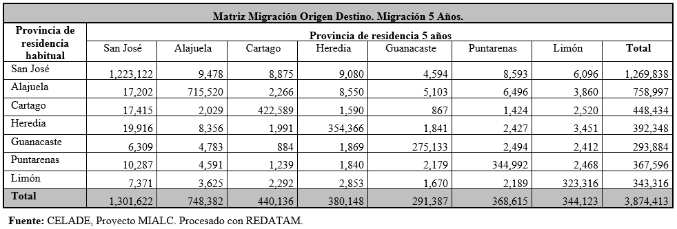Como se puede apreciar en la tabla 1, la matriz de migración reciente de Costa Rica calculada con los datos del censo de población y vivienda 2011, nos muestra los movimientos migratorios a nivel de provincias (DAM). A partir de esta matriz obtenemos una serie de indicadores derivados (tabla 2).