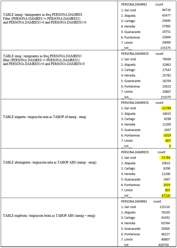 Anteriormente, cuando se necesitaba calcular los indicadores guardábamos los datos derivados de la matriz en formato Excel (.xls o xlsx) y se procedía a realizar los cálculos necesarios manipulando las planillas con la información con todas las limitantes que esto conlleva. Primero, se transformaban los valores de la migración neta en valores absolutos a través de la función abs() y luego se realizaba una suma de estos valores. Sin embargo, esto implicaba una manipulación no sencilla externa de los datos. En la nueva generación de Redatam, RedX, se han implementado una serie de funcionalidades que hacen posible manejar esta información desde Redatam, en este caso nos centraremos en la cláusula ABS.