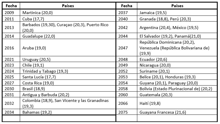 Ente 2015 y 2022, muchos países del Caribe (Barbados, Santa Lucía, Trinidad y Tabago), al igual que Chile y el Uruguay, invierten la proporción de jóvenes y adultos. En los cinco años siguientes a ese período, casi llegando a 2030, el Brasil y Costa Rica se unirán a este grupo. Finalizando el quinquenio 2030-2035, Antigua y Barbuda, Colombia, Jamaica y San Vicente y las Granadinas alcanzarán la fase de más personas mayores que jóvenes en la población total. Se prevé, en tanto, que Guatemala, la Guayana Francesa y Haití llegarán a esta etapa después de 2060.