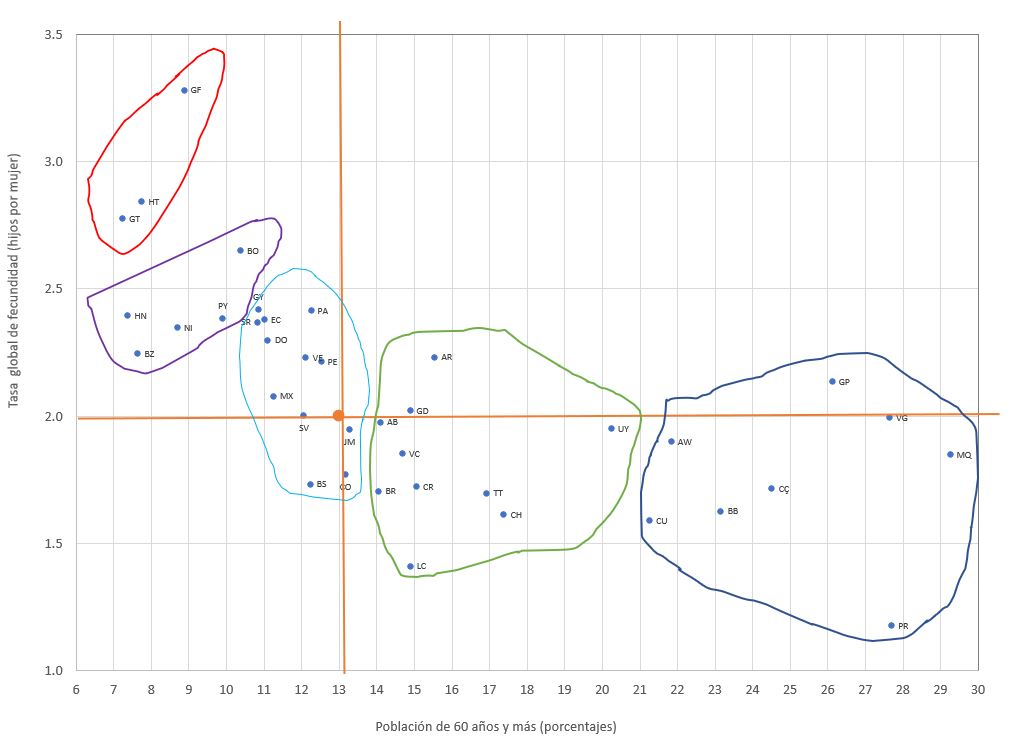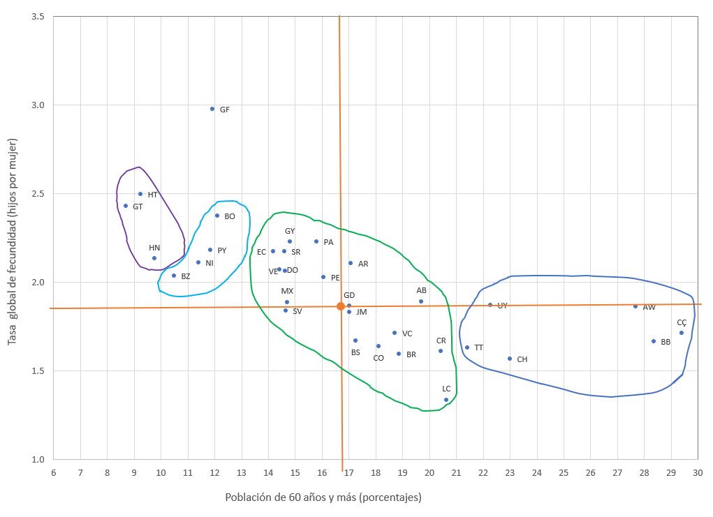 En 2020 (véase el gráfico 1), 20 países presentan una TGF por debajo del promedio regional, pero con porcentajes de población mayor que varían del 12% a casi el 30%, lo que indica que están en diferentes etapas del envejecimiento poblacional, aunque con TGF correspondientes a niveles de la etapa final de la transición demográfica. Solo tres países (Guatemala, Guayana Francesa y Haití) se encuentran en una etapa incipiente del envejecimiento, con niveles de fecundidad por encima de 2,5 hijos por mujer y entre un 7% y un 10% de población mayor. Otros cinco países (Belice, Bolivia (Estado Plurinacional de), Honduras, Nicaragua y Paraguay) se clasifican en la etapa de envejecimiento moderado por presentar el mismo rango de porcentaje de población mayor que los anteriores y una fecundidad por debajo de 2,5 hijos por mujer. La excepción es el Estado Plurinacional de Bolivia que, con más del 10% de población mayor, presenta niveles de fecundidad registrados en países con transición incipiente. El grupo clasificado como moderadamente avanzado está conformado por 12 países (la gran mayoría pertenecientes al Caribe y Centroamérica, además de Colombia, el Perú y Venezuela (República Bolivariana de)), cuyos valores de ambos indicadores analizados se encuentran alrededor del promedio regional. Entre los países muy avanzados en el proceso de envejecimiento poblacional también hay muchos países insulares del Caribe, incluida Cuba. Por último, diez países y territorios se ubican en la etapa avanzada (Antigua y Barbuda, Argentina, Brasil, Chile, Costa Rica, Guadalupe, Santa Lucía, San Vicente y Granadinas, Trinidad y Tabago, y Uruguay), con más del 21% de población mayor.