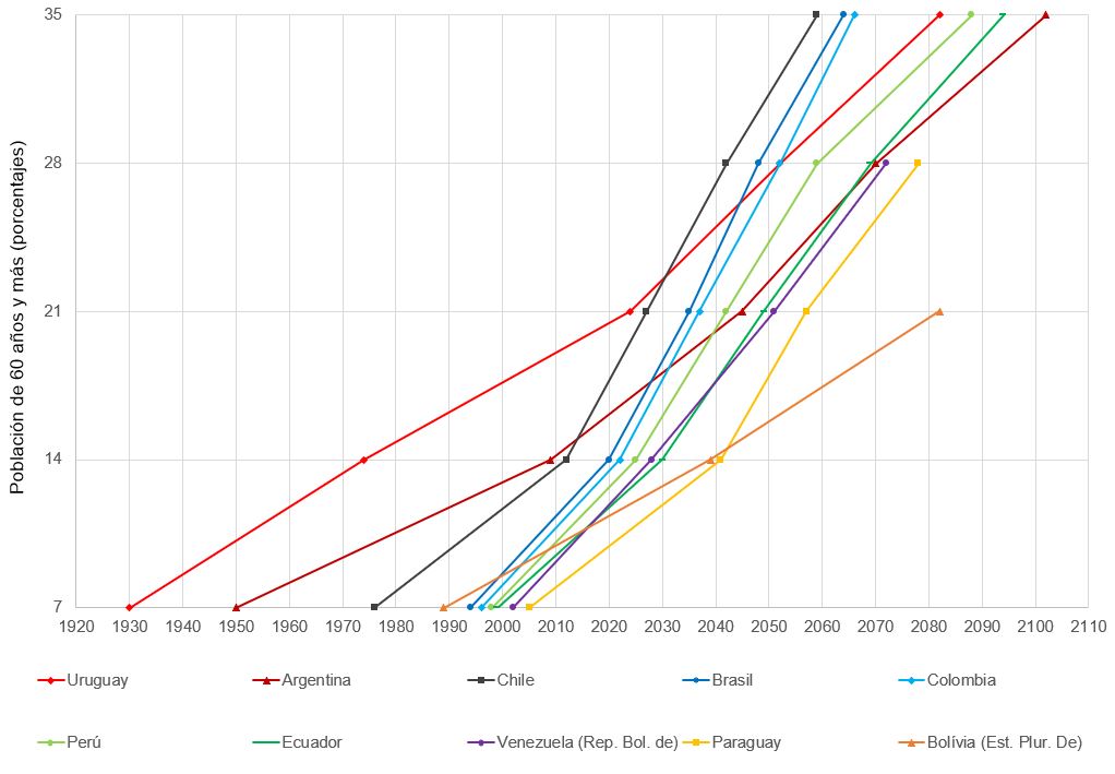 Los países que tardarán más en pasar del 7% al 28% de personas mayores son la Argentina y el Uruguay, ya que experimentan una transición demográfica más larga. Ambos países ya contaban con un 7% de personas mayores antes de 1950, pero alcanzarán el 28% recién después de 2082 en el caso del Uruguay y después de 2100 en el de la Argentina. En el otro extremo se encuentran el Brasil, Chile y Colombia , que a mediados de la década de 1990 alcanzaron el 7% personas mayores y, en menos de una generación completa, alcanzarán el 28% a lo largo de la década de 2060. También es importante observar que estos países experimentarán una aceleración del envejecimiento poblacional a partir de 2020 y que, después de alcanzar el 14% de personas mayores en la población total, tardarán menos tiempo en llegar al 21% (Chile en 2027 y el Brasil y Colombia diez años después). Por su parte, Bolivia (Estado Plurinacional de) y el Paraguay son los países que registran un proceso de envejecimiento más lento y, por tanto, demorarán más tiempo en alcanzar el 14% de personas mayores (alrededor de 2040). A partir de ese momento, el Paraguay seguirá una trayectoria de envejecimiento poblacional similar a la del grupo de países de América del Sur, con mayor velocidad de envejecimiento, mientras que el Estado Plurinacional de Bolivia seguirá una trayectoria más lenta y recién alcanzará el 21% de población de 60 años y más en 2082.
