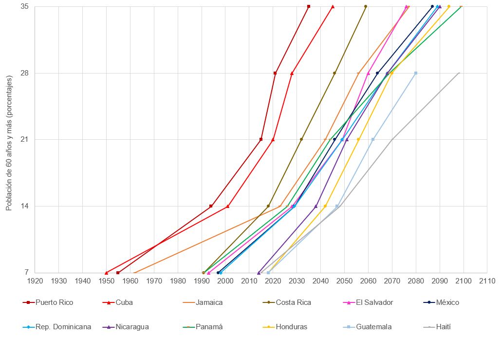 Las subregiones de Centroamérica y el Caribe también cuentan con países que experimentarán un rápido envejecimiento poblacional (véase el gráfico 4). Mientras que Cuba, Jamaica y Puerto Rico iniciaron el proceso de envejecimiento demográfico más temprano, entre 1950 y 1960, otro grupo de países lo empezó después de la década de 1990 y un tercer grupo recién alcanzó el umbral del 7% de personas mayores en su población en las décadas de 2010 y 2020. Entretanto, llama la atención el acelerado proceso registrado en Costa Rica, Cuba y Puerto Rico. Los dos primeros presentaron una trayectoria más lenta al inicio y alcanzaron el 28% de población mayor en la década de 2020. Costa Rica destaca con un rápido crecimiento de la población mayor, que en menos de 70 años pasa a representar del 7% al 35% de la población total.
