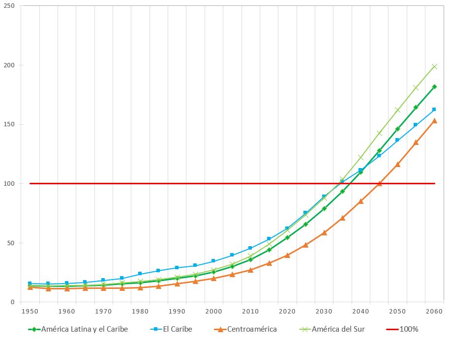 Dos hechos resultan importantes de resaltar en cuanto al índice de envejecimiento. Primero, se puede observar que las subregiones de América Latina y el Caribe por muchas décadas tuvieron menos de 50 personas mayores por cada 100 jóvenes, pero a partir de la década de 2010 el envejecimiento poblacional se intensifica, con algunas diferencias entre las distintas subregiones. Mientras que en Centroamérica el proceso se da de manera más lenta, se espera que el Caribe registre una desaceleración en relación con el promedio regional. América del Sur, por su parte, es la más populosa y liderará el proceso de envejecimiento poblacional en las próximas décadas.