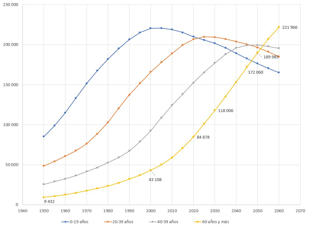Antes de llegar a una población envejecida, la estructura etaria de la población pasa por un proceso continuo de envejecimiento, con el aumento de los grupos etarios en cada una de las generaciones. Con el objeto de contar con un panorama más completo de este proceso, se analizará la evolución del volumen poblacional de cada una de las generaciones de cuatro segmentos etarios pertenecientes a los siguientes grupos de edades: 0 a 19 años, 20 a 39 años, 40 a 59 años y 60 años y más. Se considera una sociedad juvenil cuando la mayoría absoluta de la población tiene menos de 20 años, una sociedad adulta joven cuando la mayoría de las personas tienen entre 20 y 39 años, una sociedad adulta cuando la mayoría de sus habitantes tienen entre 40 y 59 años y una sociedad envejecida cuando la mayoría de las personas tienen 60 años y más.