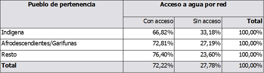 Observando los porcentajes de la tabla 4, podemos concluir que, al desagregar la población por pueblo de pertenencia, el porcentaje de población que no cuenta con red de agua por cañería dentro de la vivienda y el terreno es alto, especialmente en la población indígena del país.
