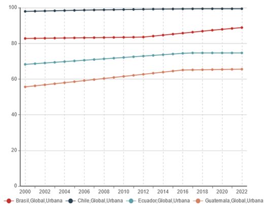 A continuación, se presenta, de manera referencial, el indicador: “Proporción de la población que utiliza servicios de suministro de agua potable gestionados sin riesgos, desglosada en zonas urbanas y rurales (en porcentajes)” para Guatemala, Brasil, Chile y Ecuador. Este indicador mide “la proporción de población que utiliza servicios de agua potable gestionados de forma segura se está midiendo actualmente por la proporción de población que utiliza una fuente de agua potable básica mejorada que se encuentra en las instalaciones, disponible cuando sea necesario y libre de contaminación fecal (y química prioritaria). Las fuentes de agua potable "mejoradas" incluyen: agua entubada a vivienda, patio o parcela; grifos públicos o tubos de espera; pozos o pozos de tubo; pozos excavados protegidos; manantiales protegidos; agua envasada; agua y agua de lluvia.” No se puede comparar directamente con la información anterior, pues provienen de fuentes diferentes.