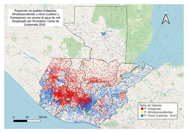 Tabla 4: Proporción de población que cuenta con acceso a agua para comer y cocinar por cañería dentro de la vivienda y el terreno, desagregado por pueblo de pertenencia. Censo Guatemala 2018 (%)