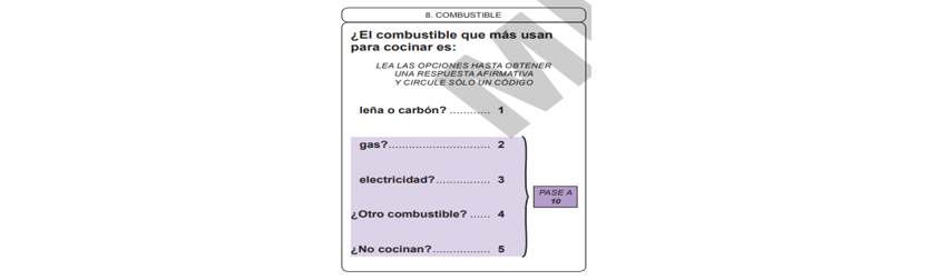 - Conceptos clave: para la definición de combustibles limpios que se utilizan en las viviendas, se tomó la variable combustible, captada en el censo de población 2020 de México, que se muestra en la imagen 1. De ella, fueron descartadas la leña o carbón, para sólo tomar en consideración gas y electricidad como combustibles limpios como fuente primaria de energía, como se menciona “Los censos incluyen habitualmente el combustible utilizado para cocinar aunque no el tipo de dispositivo que se usa para esa actividad. En la mayoría de los países, las categorías utilizadas remiten al uso de combustibles sólidos o no sólidos (no contaminantes) en el sentido que lo mencionan los metadatos de ODS. No se incluye en general aspectos relacionados a la calefacción e iluminación del hogar (aunque este último aspecto está contemplado en las preguntas sobre acceso a la electricidad). Si bien es posible incluir preguntas sobre combustible utilizado para calefacción e iluminación en el caso de la próxima ronda se considera suficiente mantener las preguntas habituales discutiendo tal vez una más precisa formulación de la pregunta y un sistema de categorías más amplio sobre los combustibles”. Pag 50, Los censos de la ronda 2020: desafíos ante la Agenda 2030 para el Desarrollo Sostenible, los Objetivos de Desarrollo Sostenible y el Consenso de Montevideo sobre Población y Desarrollo (Serie Población y Desarrollo, 2017) http://repositorio.cepal.org/bitstream/handle/11362/42394/1/S1700849_es.pdf