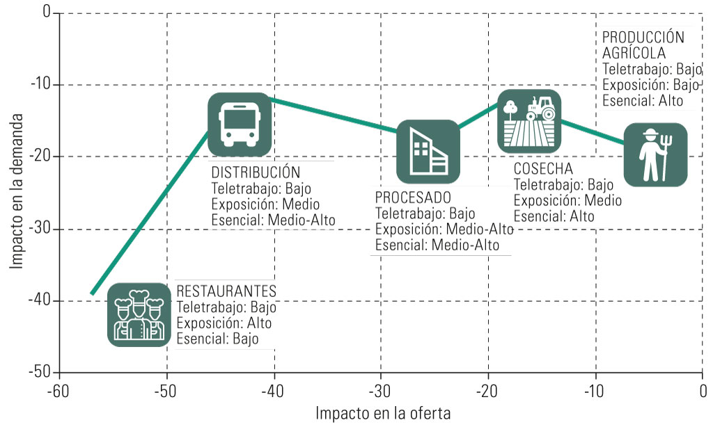 Impactos del COVID-19 sobre diferentes actividades relacionadas con el suministro alimentario en términos de demanda y oferta.