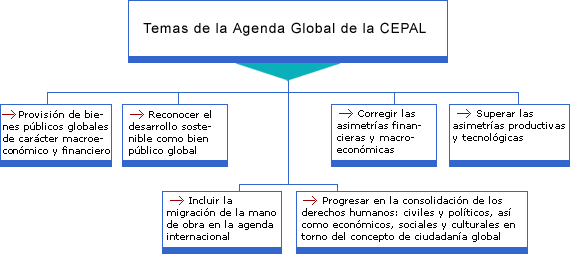 En su documento Globalización y desarrollo, la CEPAL propone "alternativas deseables" para la búsqueda de una globalización más sólida y equitativa así como para una mejor inserción en el proceso. Su agenda procura "superar el déficit de gobernabilidad global" para "conseguir que la mundialización se convierta en una fuerza positiva para todos?".