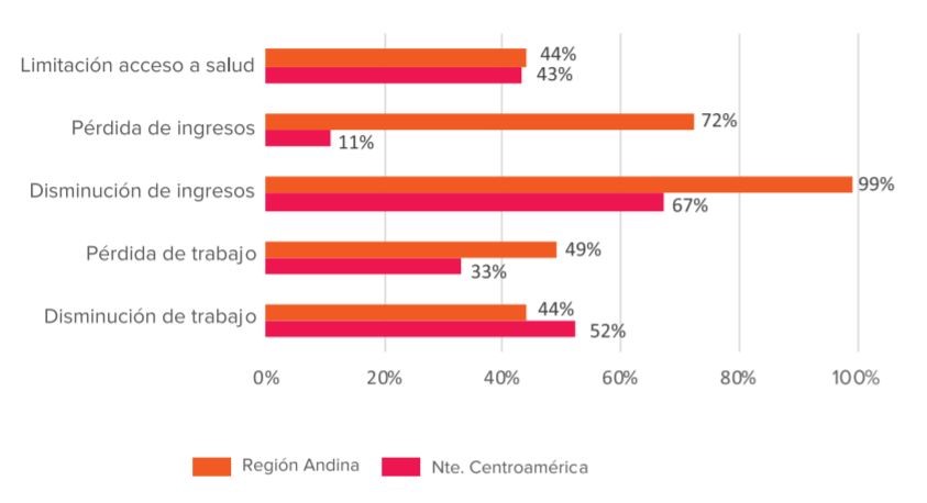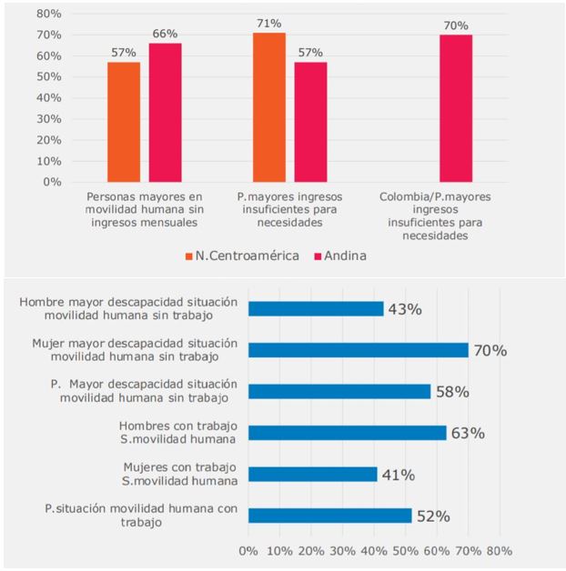 En los países de la región norte de Centroamérica, la disminución de ingresos es del 67% y la pérdida de ingresos llega al 11%. En los países de la región andina, en tanto, la disminución de ingresos afecta a un poco más de la mitad de las personas encuestadas. En el caso de los movimientos mixtos, la disminución de ingresos supera el 50% y la pérdida de ingresos afecta a más de un tercio del total de la población mayor (36%).