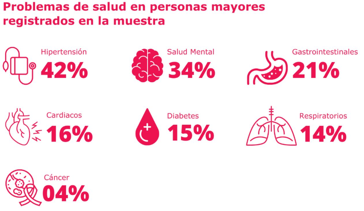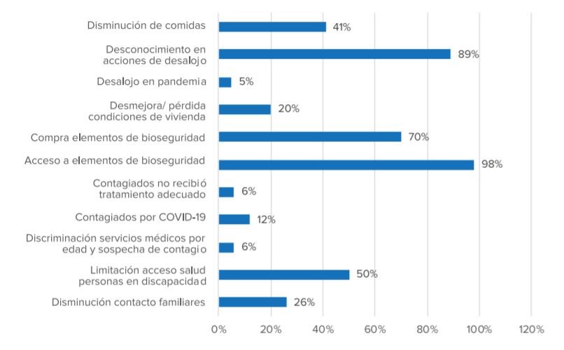 Un 6% de las personas indicaron que, debido a su edad, sufrieron discriminación para acceder a los servicios médicos solo por ser sospechosas de tener COVID-19 y un 12% del total de personas que conforman la muestra se contagiaron. De este último porcentaje, un 6% no recibió el tratamiento adecuado. Un 98% de las personas dijeron que tenían acceso a elementos de bioseguridad y un 70% los compraba. La pandemia también ha generado dificultades para la gestión de la documentación al disminuir las posibilidades de traslado a las oficinas donde se hacen los trámites o por las dificultades de acceso a procedimientos en línea.