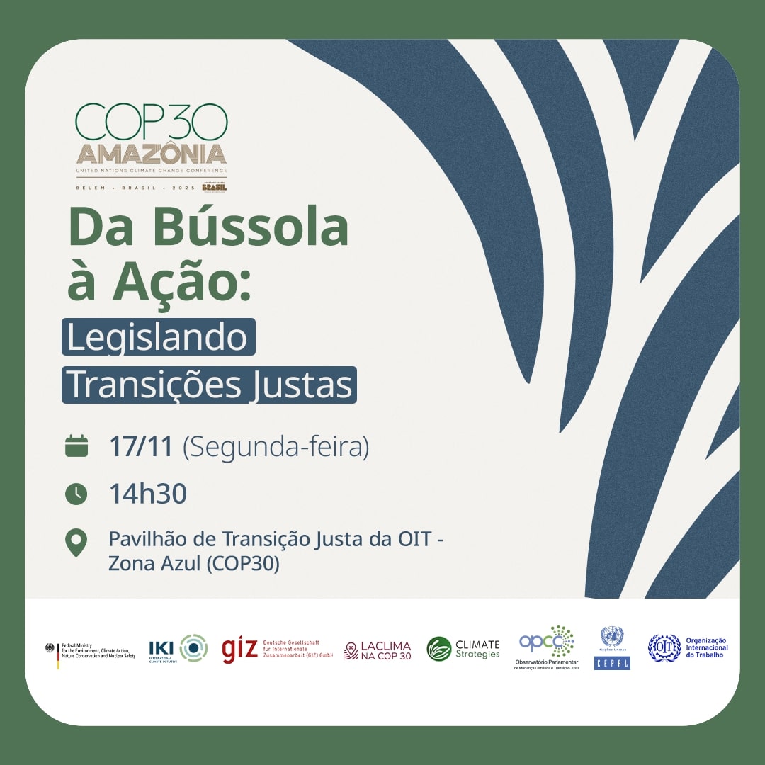 O evento “Da Bússola à Ação: Legislando as Transições Justas”, que será realizado em 17 de novembro, no Pavilhão de Transição Justa da OIT, na Zona Azul da COP30, é organizado conjuntamente pelo Observatório Parlamentar de Mudança Climática e Transição Justa (OPCC), a Organização Internacional do Trabalho (OIT) – Brasil, a GIZ, a LACLIMA e a Climate Strategies.