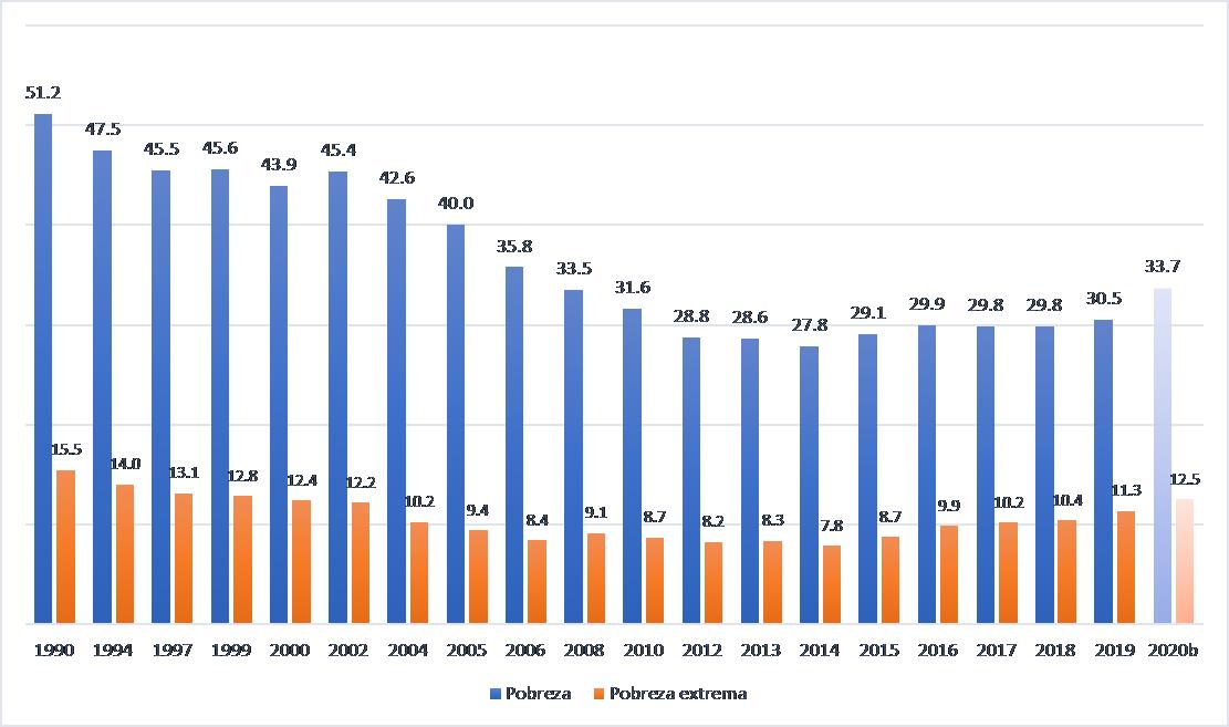 América Latina (18 países): personas en situación de pobreza y pobreza extrema, 1990-2020