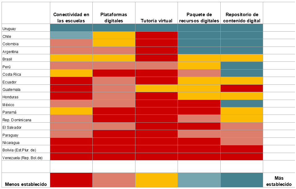 En el diagrama 1 se evidencia hasta qué nivel los sistemas educativos de distintos países de la región estaban preparados para implementar alternativas educativas digitales previo a la llegada del COVID-19. Los resultados del estudio destacan al Uruguay[2] por contar con las mejores condiciones, seguido de Chile y Colombia. En el extremo opuesto, con condiciones de mayor precariedad, se encuentran Nicaragua, el Estado Plurinacional de Bolivia y la República Bolivariana de Venezuela. El resto de los países registra condiciones sub-óptimas en al menos tres de los cinco elementos considerados.