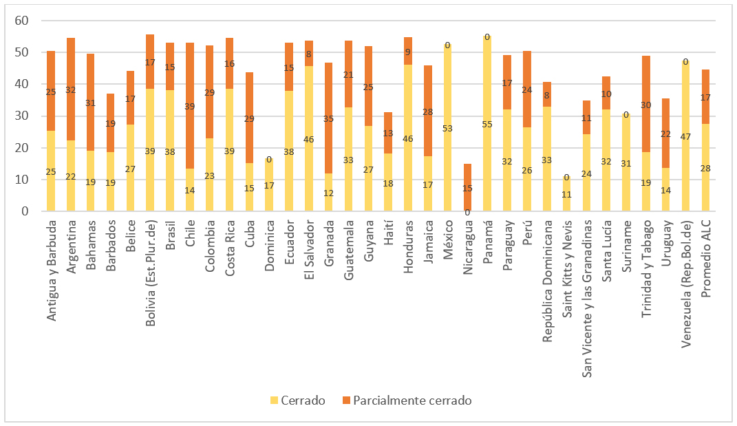 América Latina y el Caribe (33 países): tiempo de cierre completo o parcial del sistema educativo presencial (educación primaria, secundaria y terciaria), 16 de febrero de 2020 a 31 de mayo de 2021