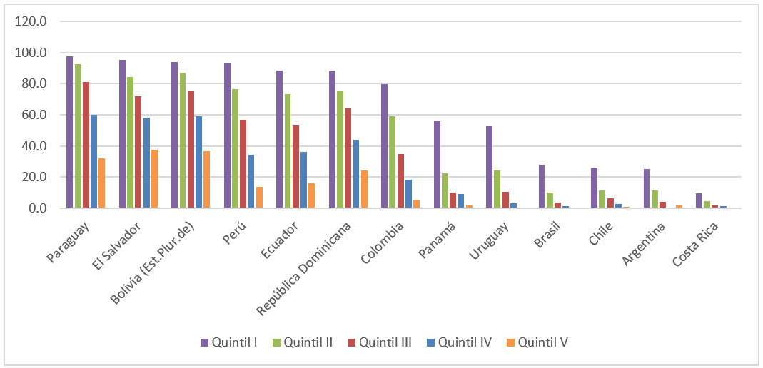 América Latina (13 países): hogares con niñas y niños según quintiles sin acceso a Internet