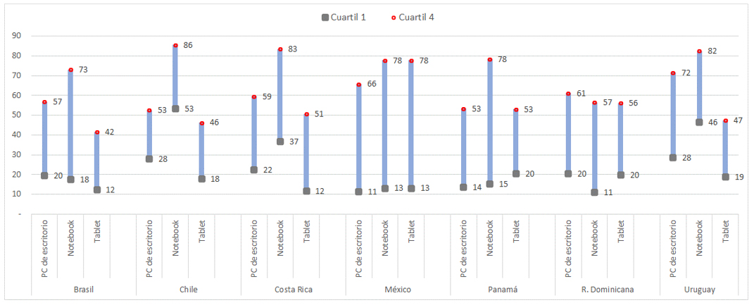 América Latina (7 países): estudiantes de 15 años que cuentan con dispositivos digitales en el hogar, por tipo de dispositivo y cuartil socioeconómico, 2018