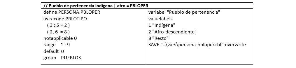 Como se puede observar en el siguiente cuadro, en donde se presenta la programación para crear la variable básica, se recodifica una variable de acuerdo con la definición del país. Este es un ejemplo sencillo de programación. En algunos países, tomar una decisión para agrupar a las personas afro indígenas requiere de un análisis más detallado.