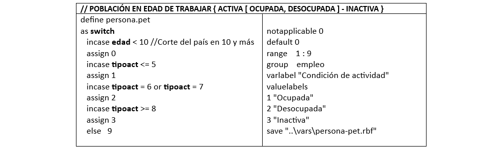 b) Al mismo tiempo se generan las variables que caracterizan a la población, y que no existen como tal para este sistema. Por lo tanto, deben crearse con Redatam. En algunos casos, variables como sexo y edad también es necesario recodificarlas para poder generar programas genéricos que posibiliten una salida de datos estandarizada, que luego permita a través de pocos comandos, obtener grandes volúmenes de información que alimenten CEPALSTAT. Es importante recordar que se trabaja con bases de 17 países y por ello se necesita ser lo más eficientes posibles. Una variable que requiere un mayor detalle en su creación es la de la población económicamente activa, en este caso la “complicación” radica en que debemos utilizar filtros que remiten a otras variables, como la edad. Este problema se soluciona con el comando switch, el que permite combinar distintas variables para construir otras. De esta manera, asegura que la población solamente tenga determinadas edades, de manera consistente a la pregunta de población en edad de trabajar (PET).