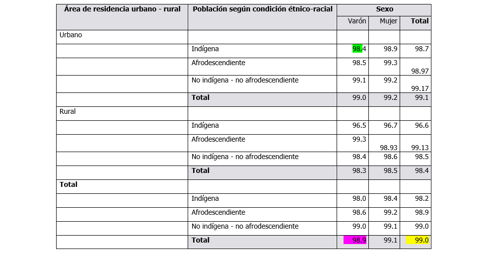 Asistencia escolar de la población de 6 a 11 años que asiste a algún establecimiento educativo según condición étnico-racial por sexo y área de residencia. |