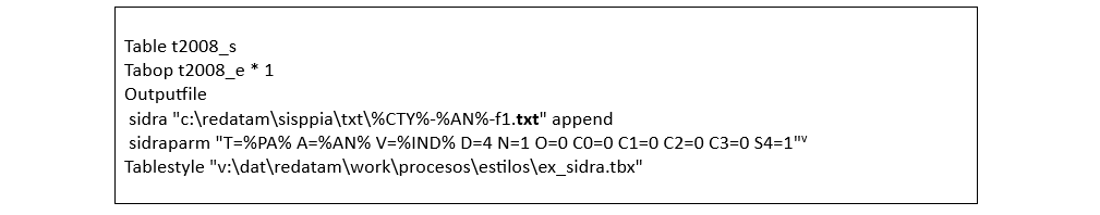 Hasta aquí la programación de variables y uso de comandos cumple con lo que regularmente hacemos en Redatam cuando se obtiene un indicador. Sin embargo, existe la posibilidad de obtener esta misma información en otro tipo de salida llamado SIDRA2, que es la que nos permite obtener una gran cantidad de datos en un formato estandarizado.