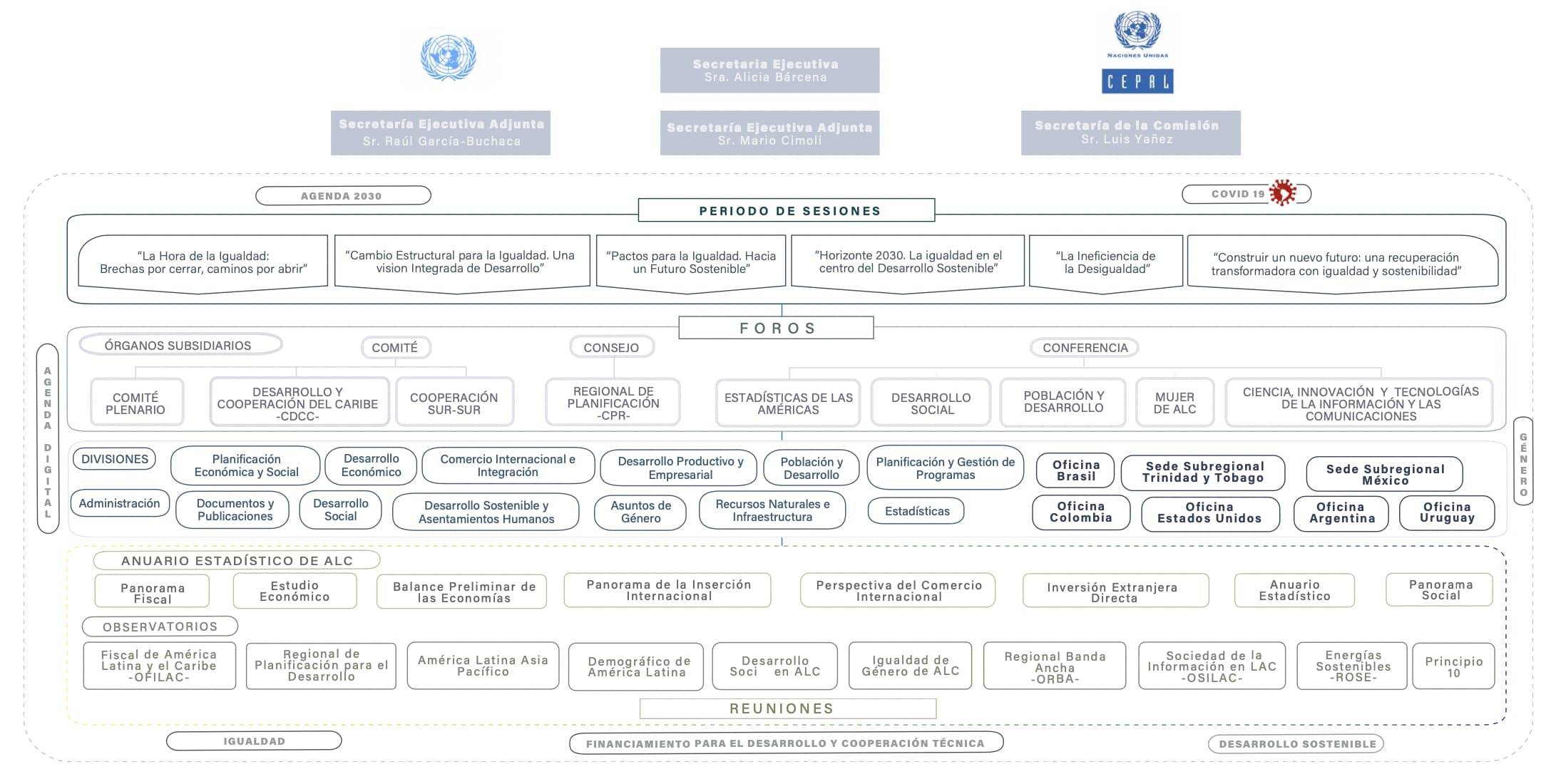 A través de diversos órganos intergubernamentales; foros y reuniones de alto nivel; y variados mecanismos de cooperación regionales e internacionales, la CEPAL promueve el desarrollo económico, social y ambiental mediante la cooperación y la integración, a nivel regional y subregional.